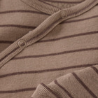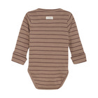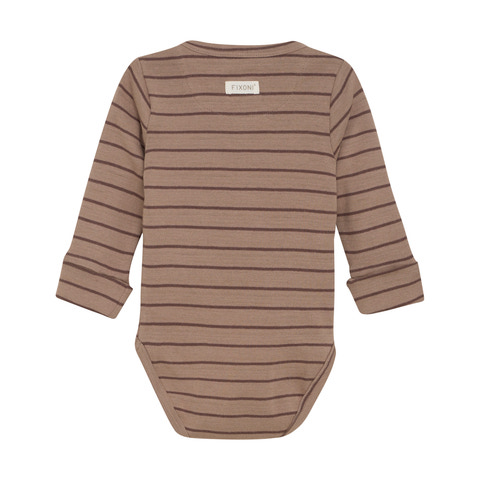 Stribet langærmet body fra FIXONI med smarte justeringsmuligheder. Bodyen lukkes med trykknapper foran og mellem benene. Den har justerbare trykknapper i skridtet, så længden kan tilpasses barnets vækst – og dermed forlænges brugstiden. Ærmerne har dobbelt lag, som kan foldes ind eller ud alt efter barnets størrelse.